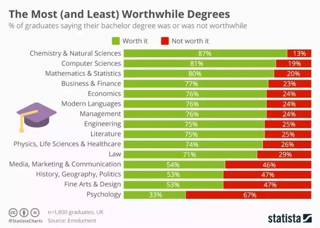 最近,國外一家薪資調(diào)查網(wǎng)站Emoulment公布了一個調(diào)查結(jié)果:由1800名應屆畢業(yè)生評選出的,大學里最有用和最不值得讀的專業(yè)。