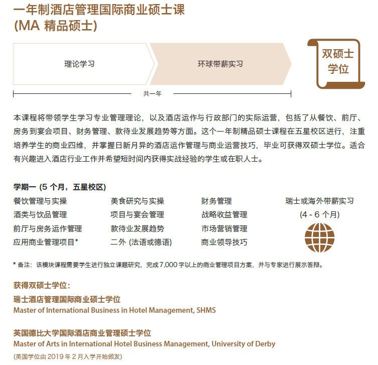 自2019年入學學生開始,完成所有課程畢業(yè)后,即可獲得瑞士酒店管理大學及英國德比大學兩校頒發(fā)的碩士學位證書,學歷受到全球認可,學生畢業(yè)后可輕松選擇在世界各國工作,如回到中國國內(nèi)就業(yè),也可辦理中國教育部學歷認證!