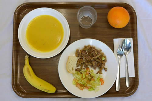 煎蛋卷,素菜湯,香蕉酸奶和水,這是西班牙馬德里Chiquitin幼兒園2014年5月的一個星期二為學生提供的午餐。世界上許多國家政府都致力于讓學校的午餐更富有營養(yǎng),美國第一夫人米歇爾更是直接負責美國的學校午餐計劃。