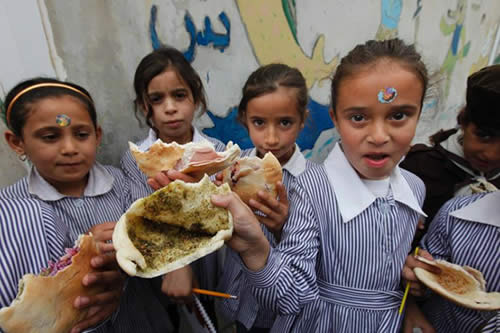 巴勒斯坦那不勒斯的學生們在午餐時拿出了自帶的皮塔面包,面包大多是自己家里做的,面包里面填的是橄欖油和有辣味的香料。