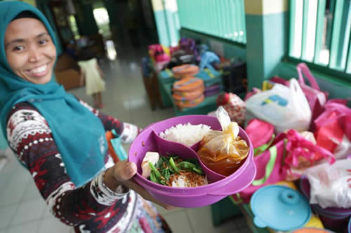 印度尼西亞的雅加達,一個女傭人為家里的小主人準備好了一份午餐,里面包括大米,肉丸子湯,豆腐和蔬菜。